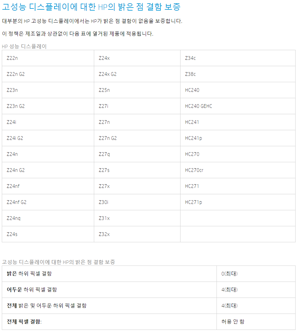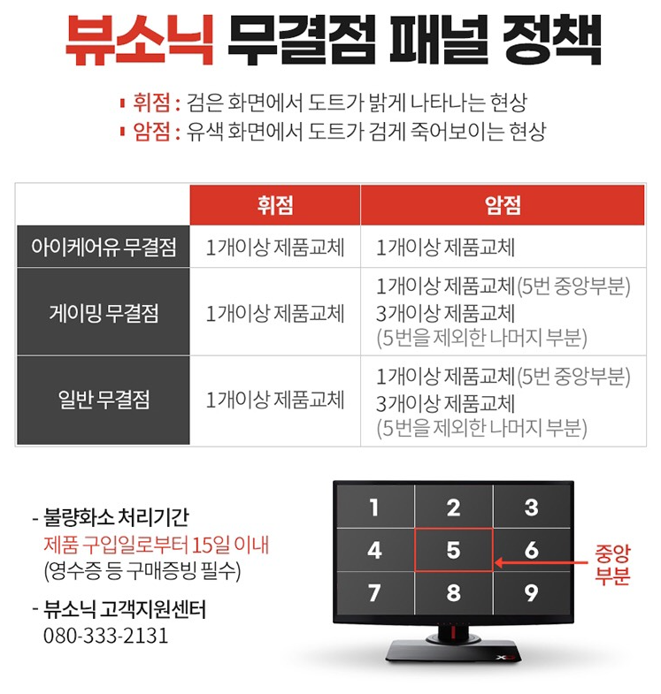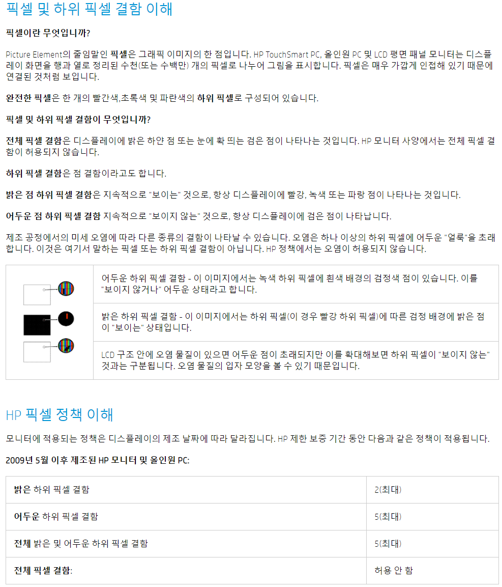 모니터의 무결점정책이라고 하면 언뜻 결점이 전혀없어야 정상인데, 모니터 업체들은 무결점을 그냥 타이틀로만 하고 그 무결점정책이라는 이름하에 픽셀 불량의 한도를 정해서 판매하고 있습니다. 그래서 무결점정책이라는 말 = 결점이 없다는 의미가 아니고 "이 정도의 결점은 무결점으로 본다" 는 의미로 받아들이셔야 합니다.