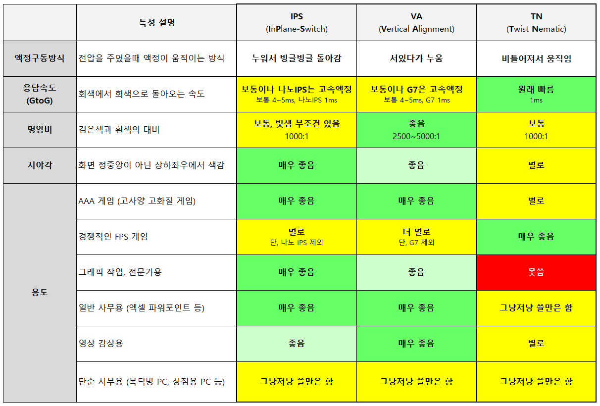 1000:1 시야각 화면 정중앙이 아닌 상하좌우에서 색감 매우 좋음 좋음 별로 용도 AAA 게임 (고사양 고화질 게임) 매우 좋음 매우 좋음 별로 경쟁적인 FPS 게임 별로