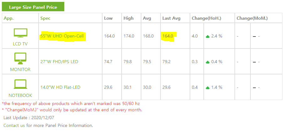 20년 12월 기준으로 55"UHD 패널 가격이 164불입니다. 6개월만에 50%가 올랐습니다.