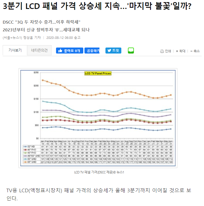 발표한 내용을 들어 55"UHD 패널가격이 20년 6월 기준 110불 정도라고 되어 있네요.